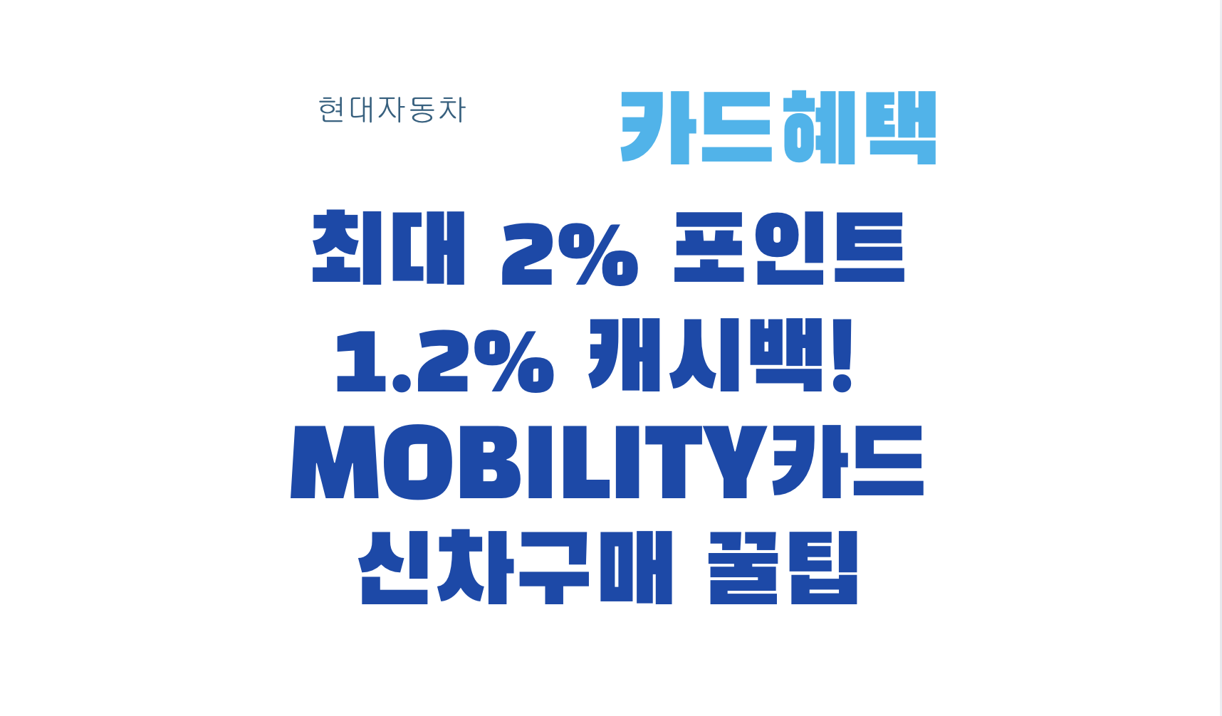 현대 Mobility카드·EV카드 7월 신차 프로모션 완벽 가이드 Hyundai Mobility카드 7월 신차구매 혜택을 제대로 챙기면, 최대 2% 블루멤버스 포인트 적립 또는 최대 1.2% 캐시백까지 받을 수 있어요. 카드 할부, 블루 세이브-오토 등 다양한 혜택을 꼼꼼히 비교해보세요!Hyundai Mobility카드 7월 신차구매 혜택 한눈에 보기구분블루멤버스 포인트 적립캐시백비고Hyundai Mobility카드/EV카드/상용차1.5%1.2% (블루 세이브-오토 이용 시)포인트/캐시백 중복 불가Hyundai Mobility Platinum카드2%1.2% (블루 세이브-오토 이용 시)포인트/캐시백 중복 불가※ 일시불 결제 시 포인트형 또는 캐시백형 중 선택, 둘 다 받을 수 없어요.카드 할부 혜택도 놓..