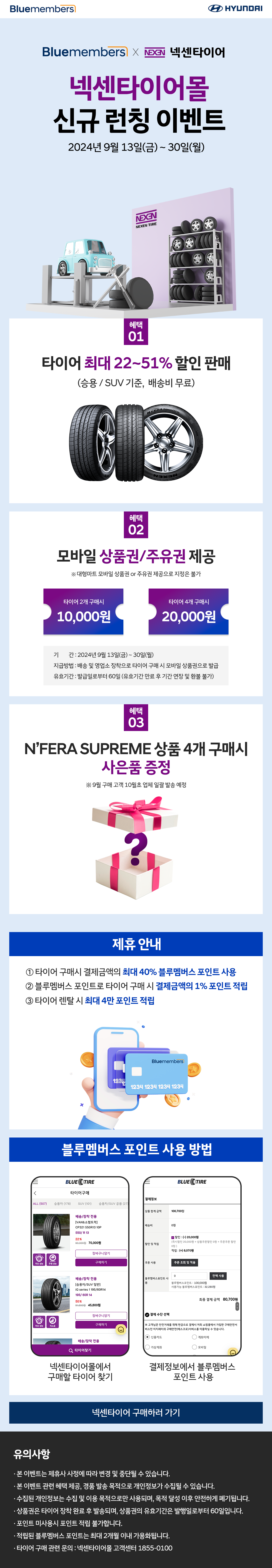 2024년 9월 13일부터 30일까지 넥센타이어몰에서 블루멤버스 회원을 위한 특별한 런칭 이벤트가 진행됩니다. 타이어를 최대 51% 할인된 가격에 구매하고, 구매 금액에 따라 모바일 상품권을 증정합니다. N'FERA SUPREME 상품을 4개 구매하면 추가 사은품도 제공! 블루멤버스 포인트로 더 많은 혜택을 누릴 수 있는 절호의 기회입니다.
