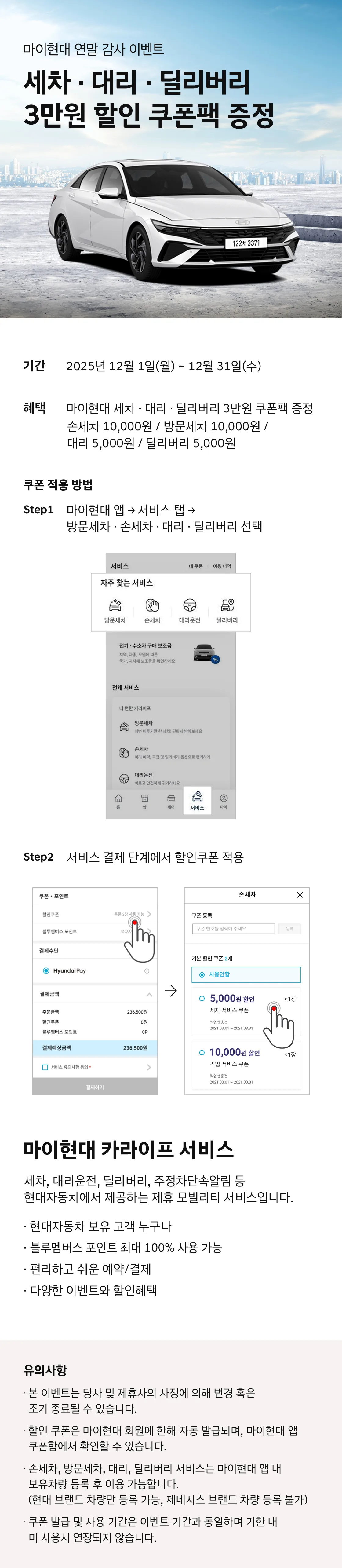 이벤트는 12월 31일까지만 진행됩니다. 3만 원이라는 혜택이 적어 보일 수 있지만 연말 지출을 방어하는 데 꽤 쏠쏠한 도움이 될 겁니다. 지금 바로 마이현대 앱에 접속해서 쿠폰 유무를 확인하고 이번 주말 세차 예약이나 저녁 모임 대리운전 예약에 활용해 보세요. 행동하는 사람만이 혜택을 누릴 수 있습니다.