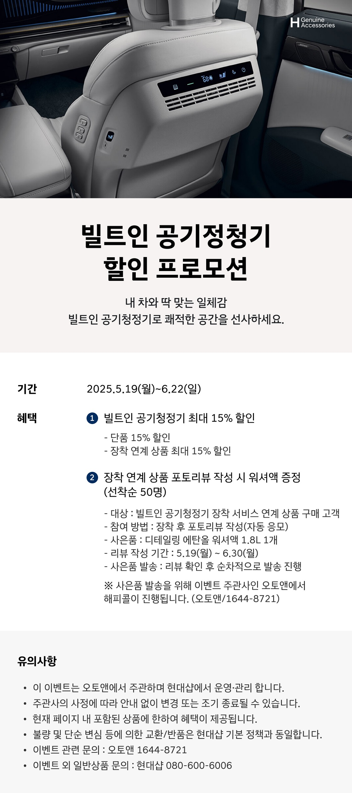 현대자동차빌트인공기청정기 차량용공기청정기할인 미세먼지차단필터 팰리세이드공기청정기 자동차실내공기질 순정부품설치 차량용헤파필터 현대샵이벤트 자동차용품할인 차량내부공기정화