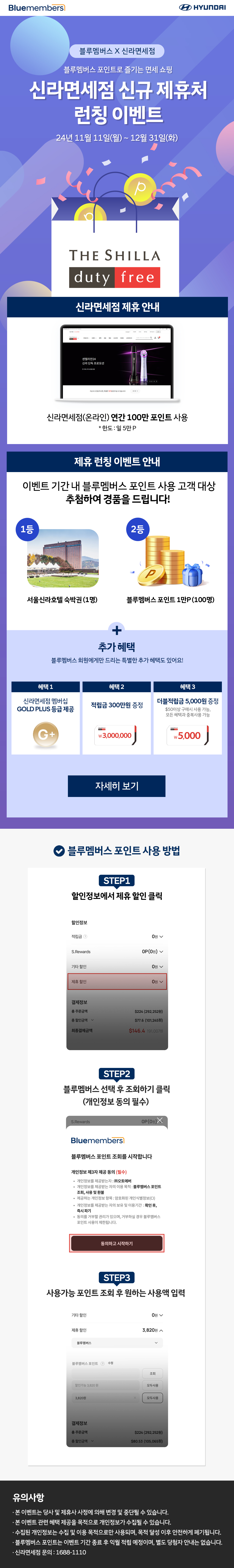 11월 11일부터 12월 31일까지 진행되는 이 특별한 이벤트, 여러분도 참여하실 거죠? 블루멤버스 포인트를 사용하면 추첨을 통해 서울신라호텔 숙박권이나 블루멤버스 포인트 1만 P를 받을 수 있대요. 대박 아닌가요?