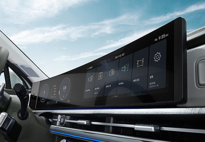 - 프레스티지 (핵심 업그레이드) 12.3인치 풀 LCD 클러스터가 적용되어 파노라믹 커브드 디스플레이가 완성되고, 2열 도어에 이중접합 차음 유리가 적용되어 정숙성이 향상되는 등 실내 만족도를 크게 높이는 사양들이 추가됩니다.