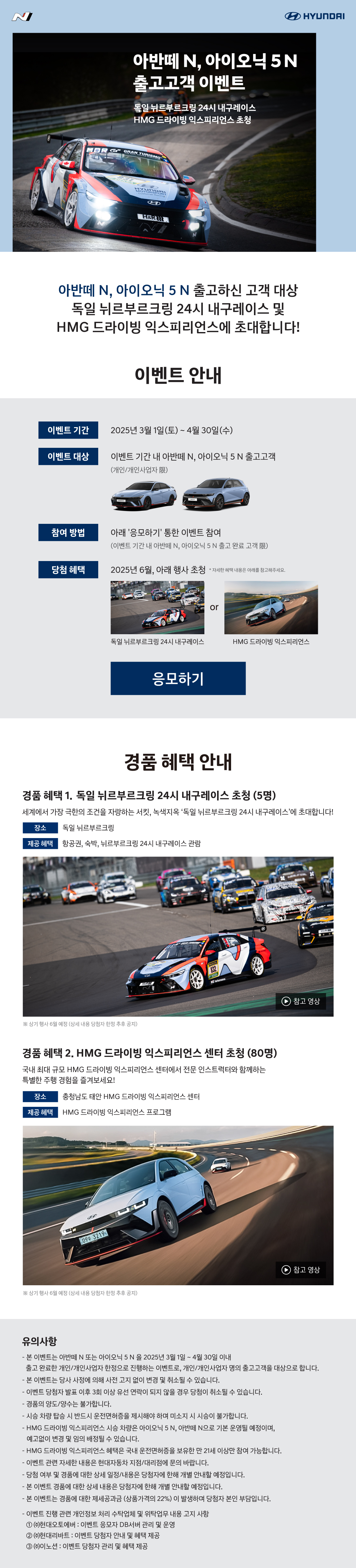 2025년 3월 1일부터 4월 30일까지 아반떼 N 및 아이오닉 5 N 출고 고객을 대상으로 현대자동차가 특별한 경험을 제공합니다. 독일 뉘르부르크링 24시 내구레이스 관람 또는 HMG 드라이빙 익스피리언스 센터 초청의 기회를 잡아보세요!