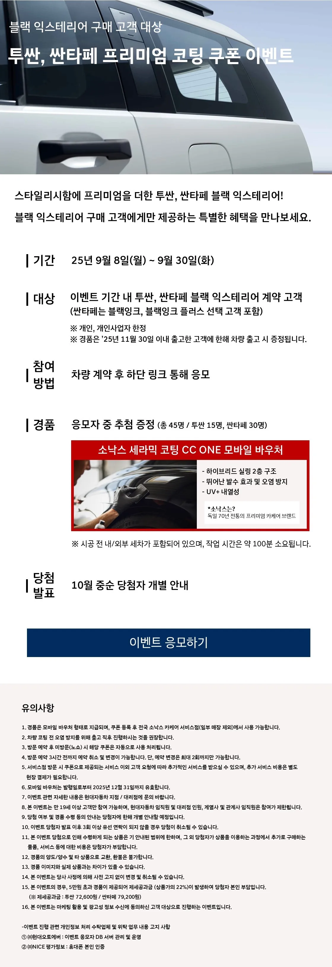 | 증정 선물 | 추첨을 통해 총 45분(투싼 15명, 싼타페 30명)에게 소낙스 세라믹 코팅 CC ONE 모바일 바우처 증정 |