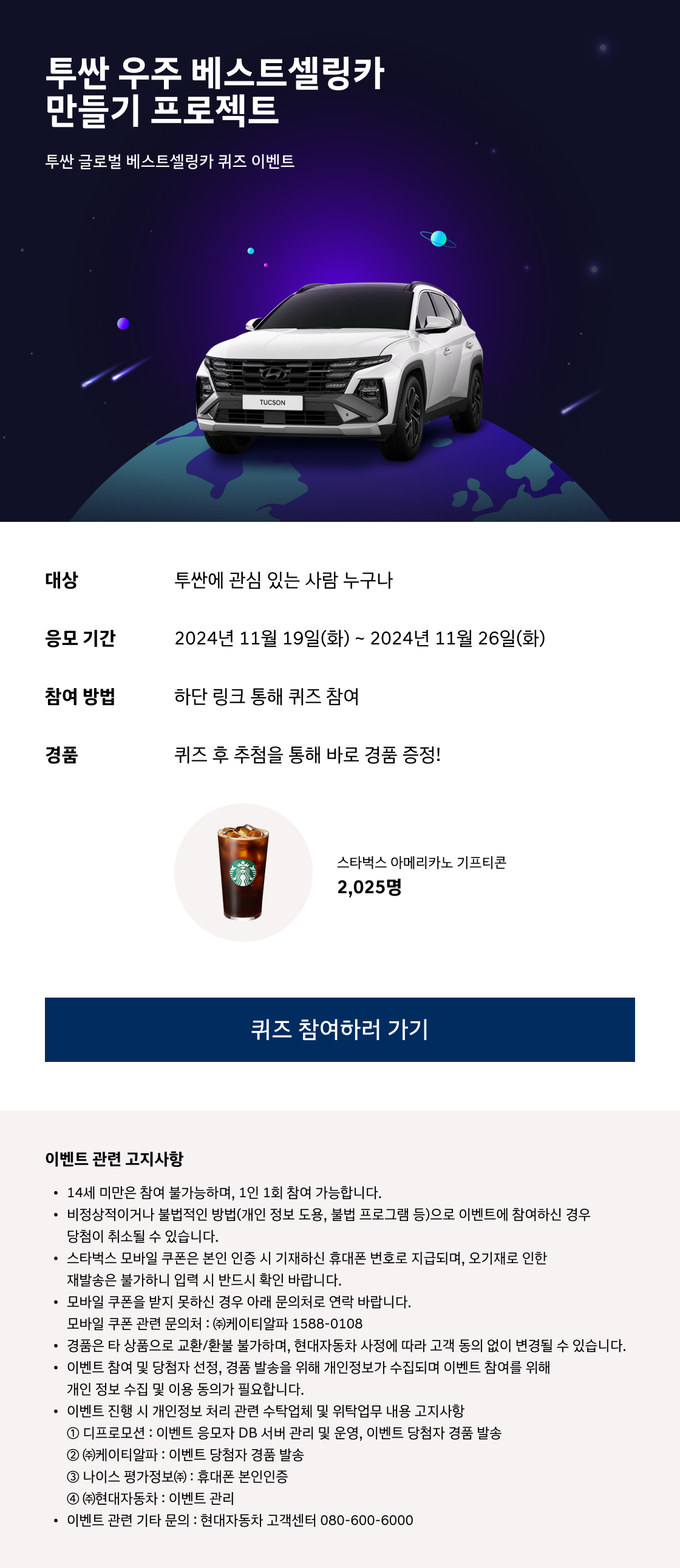 이번 이벤트의 경품으로는 무려 2,025명에게 스타벅스 아메리카노 기프티콘이 제공됩니다. 커피 한 잔과 함께 투싼에 대해 더 알아가는 시간을 가져보는 건 어떨까요?