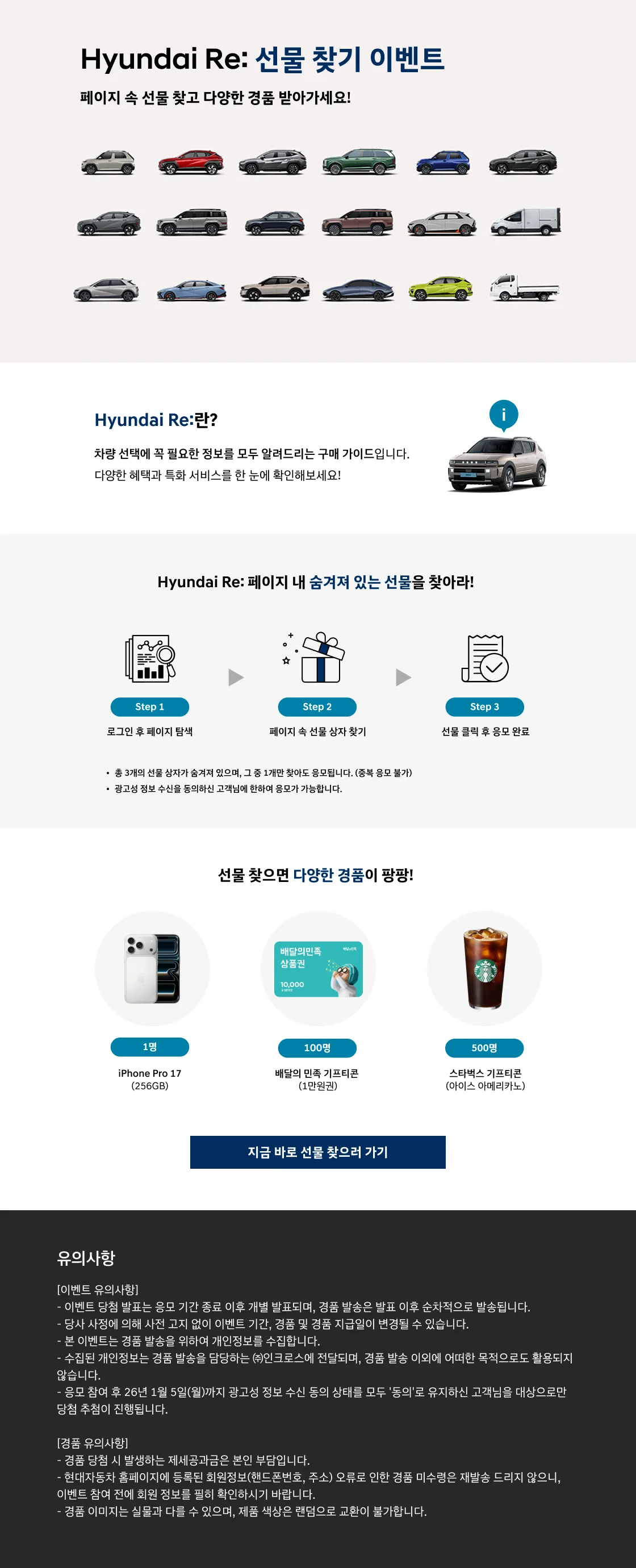 혹시 아주 간단한 참여만으로 아이폰 17 프로나 배달의민족 상품권 같은 푸짐한 선물을 받을 수 있는 이벤트를 찾고 계셨나요? 자동차 구매를 고민하며 어떤 정보부터 봐야 할지 막막했던 경험, 다들 한 번쯤은 있으시죠? 바로 그런 분들을 위해 현대자동차가 차량 구매 가이드 'Hyundai Re:' 페이지를 오픈하고, 아주 특별한 이벤트를 준비했답니다. 지금부터 숨겨진 선물을 찾고 대박 경품의 주인공이 되는 방법을 알기 쉽게 알려드릴게요!
