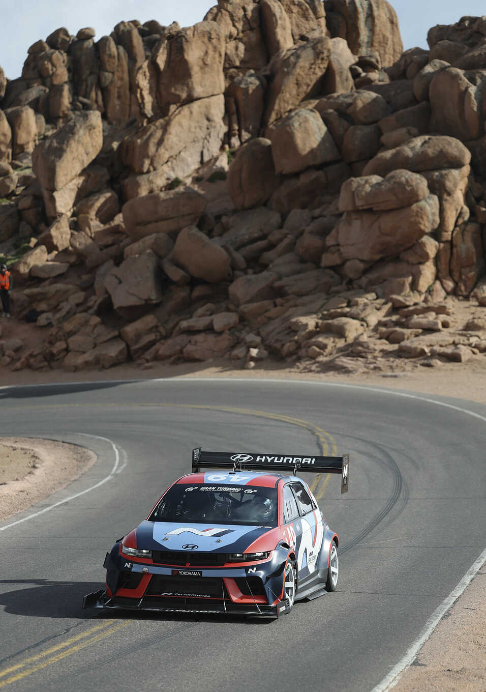 참고로 파이크스 피크의 정상 부근은 고산지대라 공기밀도가 해수면 대비 60% 수준에 그칩니다. 이런 곳에서 다운포스를 얻으려면 아이오닉 5 N TA 스펙처럼 커다란 에어로파츠가 필요합니다. 이는 운전자의 안전을 위한 것이기도 합니다. 가드레일도 없는 절벽을 달리는 만큼, 레이스카의 조작성이 아주 중요하기 때문입니다. 아울러 전기차는 내연기관차 대비 출력이 좋지만 무겁기도 합니다. 이를 극복하고 코너링 속도를 높이려면 강력한 다운포스가 필요합니다.