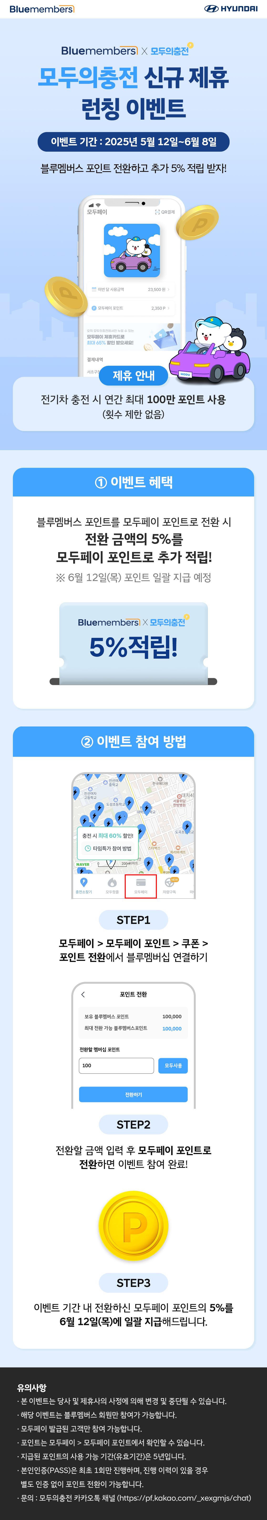 현대자동차 고객은 차량 구매나 정비 등으로 적립한 블루멤버스 포인트를 모두페이 포인트로 전환한 뒤, 충전 요금 결제 시 현금처럼 사용할 수 있게 됐어요. 전환은 모두의충전 앱 내 전용 메뉴를 통해 간편하게 진행할 수 있답니다.