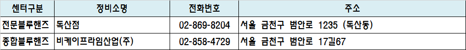 센터구분 정비소명 전화번호 주소 지도링크 전문블루핸즈 독산점 02-869-8204 서울 금천구 범안로 1235 (독산동) 지도 종합블루핸즈 비케이프라임산업(주) 02-858-4729 서울 금천구 범안로 17길67 지도