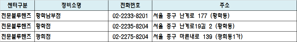 | 센터구분 | 정비소명 | 전화번호 | 주소 | 지도링크 |