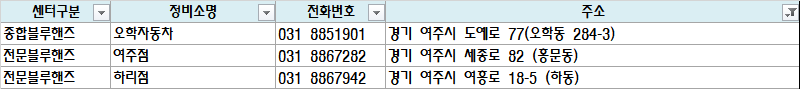 | 종합블루핸즈 | 오학자동차 | 031 8851901 | 경기 여주시 도예로 77(오학동 284-3) |