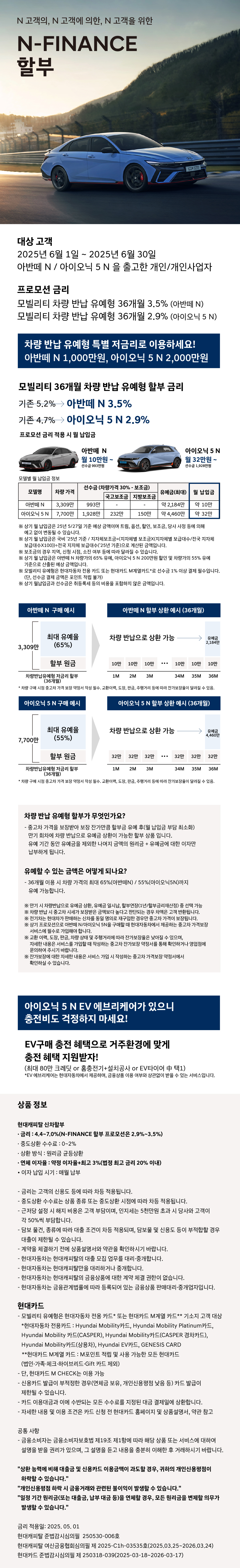 이번 특별 혜택은 2025년 6월 1일부터 6월 30일까지 딱 한 달간 진행되요. 대상 고객은 아반떼N 또는 아이오닉5N을 출고하는 개인 및 개인사업자인데요. 법인은 제외되니까 이 점 참고하셔야 할 것 같아요. 프로모션 기간이 짧은 만큼 관심 있으신 분들은 서둘러서 상담받아보시는 게 좋을 거예요.