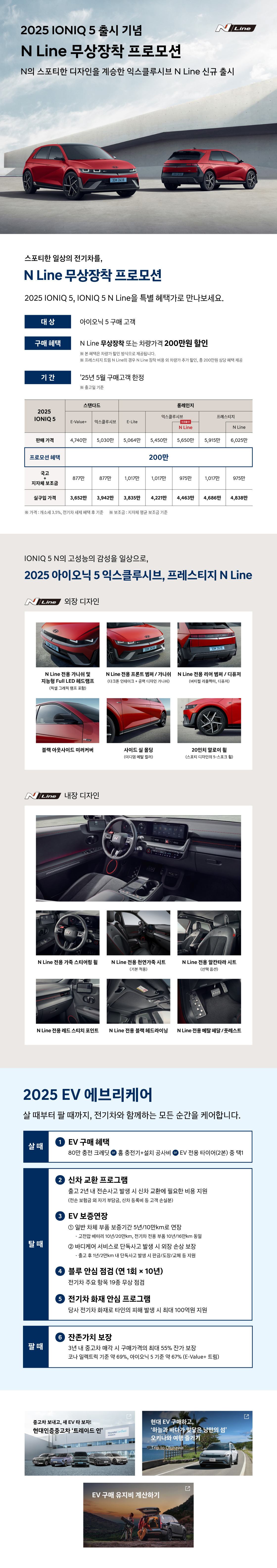 이번 프로모션은 2025년 5월 한정으로 진행되며, 아이오닉 5를 구매하는 고객이라면 누구나 혜택을 받을 수 있어요. 선택할 수 있는 혜택은 두 가지인데, N Line 패키지 무상 장착 또는 차량 가격에서 200만원 할인 중 하나를 고를 수 있죠.