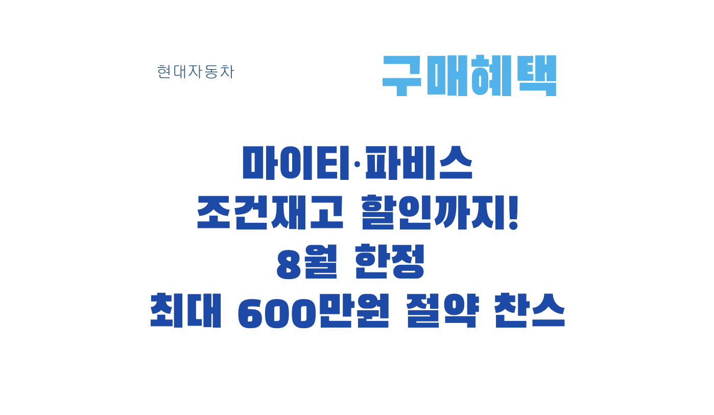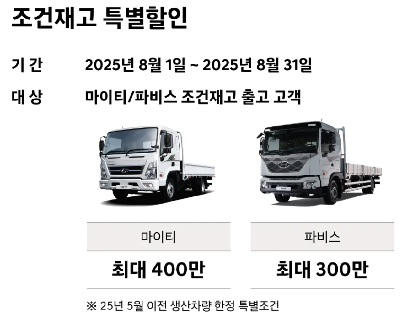 | 조건재고 특별할인 | 2025년 8월 1일 ~ 31일 | 조건재고 차량 출고 고객 | 마이티 최대 400만원 파비스 최대 300만원 |