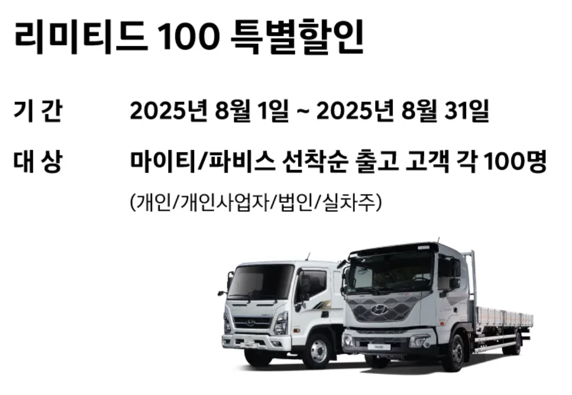 | 리미티드 100 특별할인 | 2025년 8월 1일 ~ 31일 | 마이티/파비스 선착순 출고 고객 각 100명 |