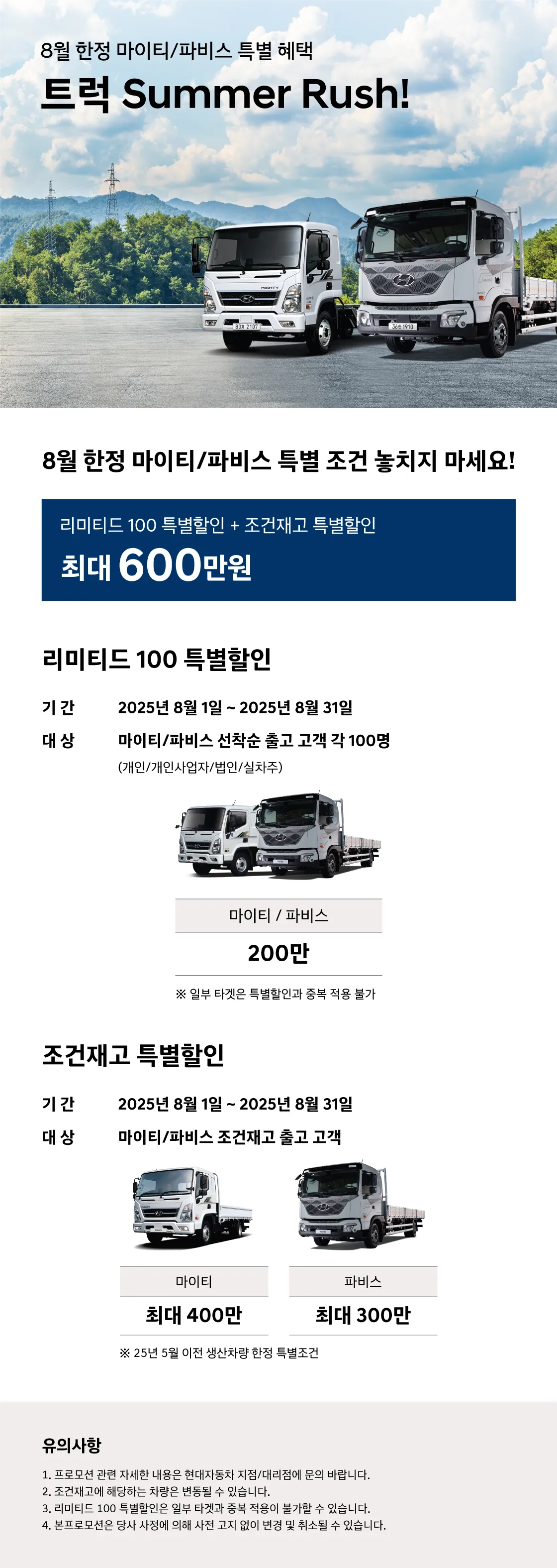 마이티·파비스 트럭을 8월에 출고할 계획이 있다면, 이번 특별 할인으로 비용을 크게 절감할 좋은 기회이에요.
