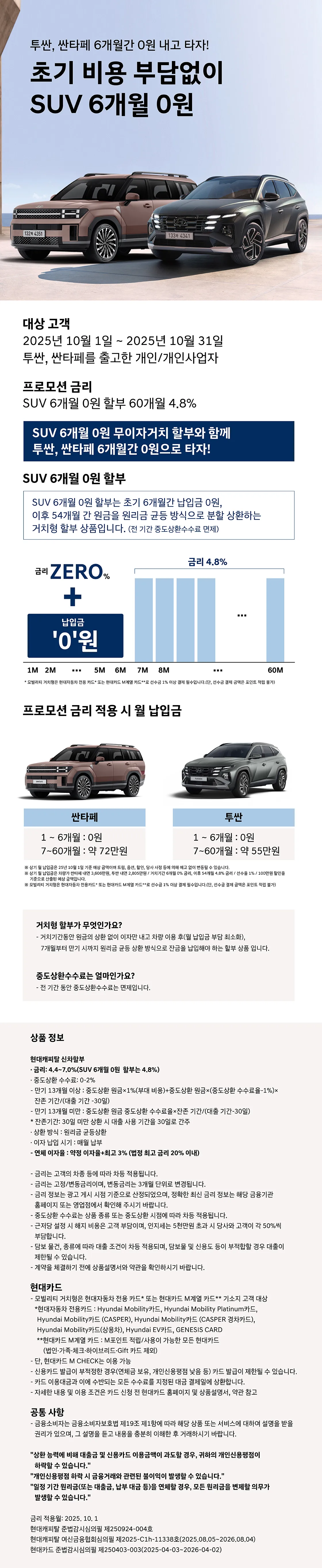 이번 'SUV 6개월 0원 할부' 프로모션은 10월 한 달간만 진행되는 한정적인 기회예요. 평소 투싼이나 싼타페 구매를 고려하고 계셨다면, 초기 비용 부담 없이 내 차를 마련할 수 있는 이번 기회를 적극적으로 활용해 보시는 건 어떨까요? 가까운 현대자동차 전시장에 방문해서 직접 상담받고 시승도 해보면서 현명한 결정을 내리시길 바랍니다!