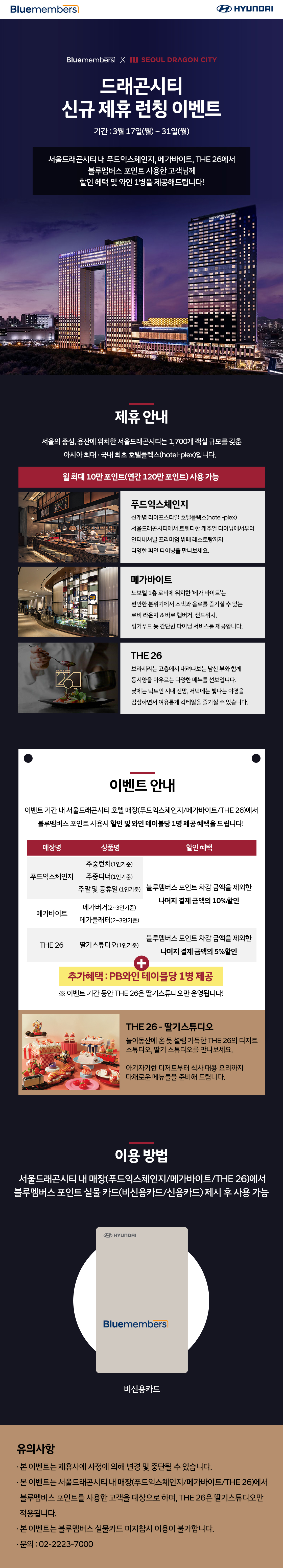- 참여 방법: 서울드래곤시티 내 해당 장소에서 블루멤버스 카드(신용카드/멤버십카드)를 제시하여 혜택 적용 가능