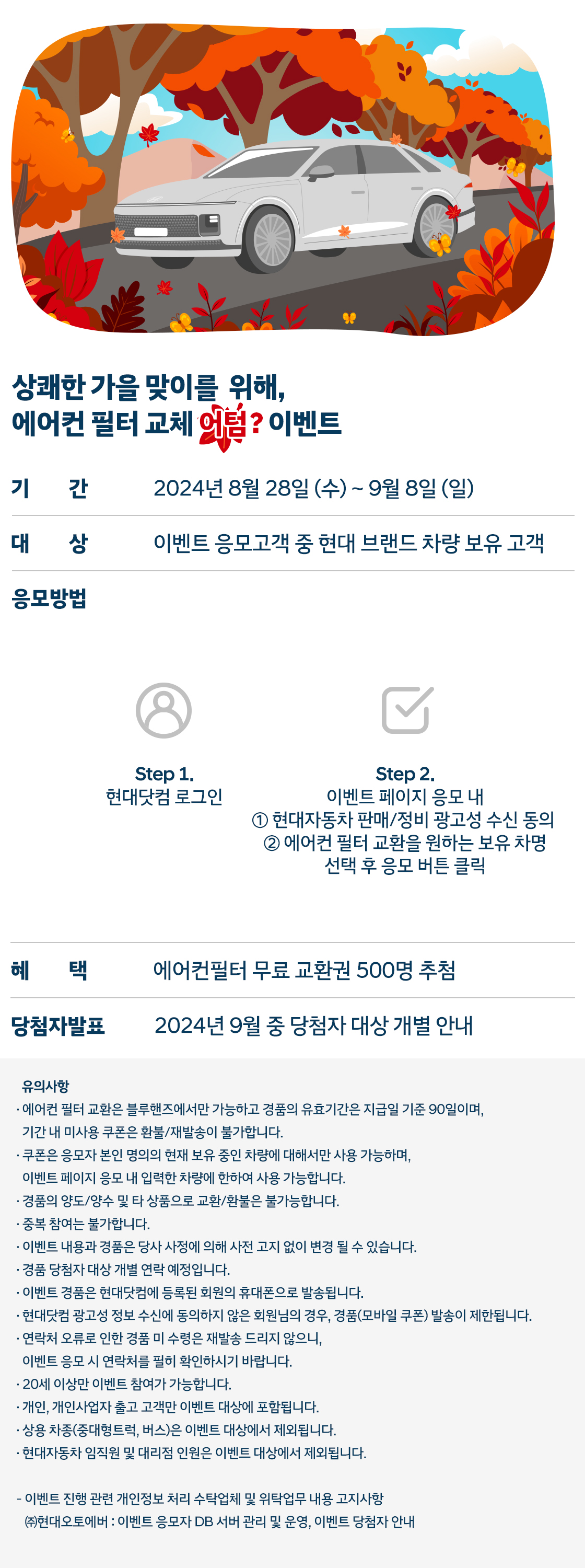 이벤트 페이지 응모 내 1현대자동차 판매/정비 광고성 수신 동의 2 에어컨 필터 교환을 원하는 보유 차명 선택 후 응모 버튼 클릭