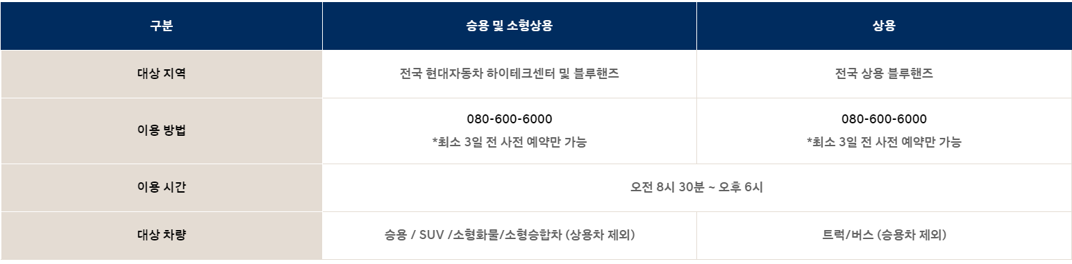 구분승용 및 소형상용상용대상 지역이용 방법이용 시간대상 차량