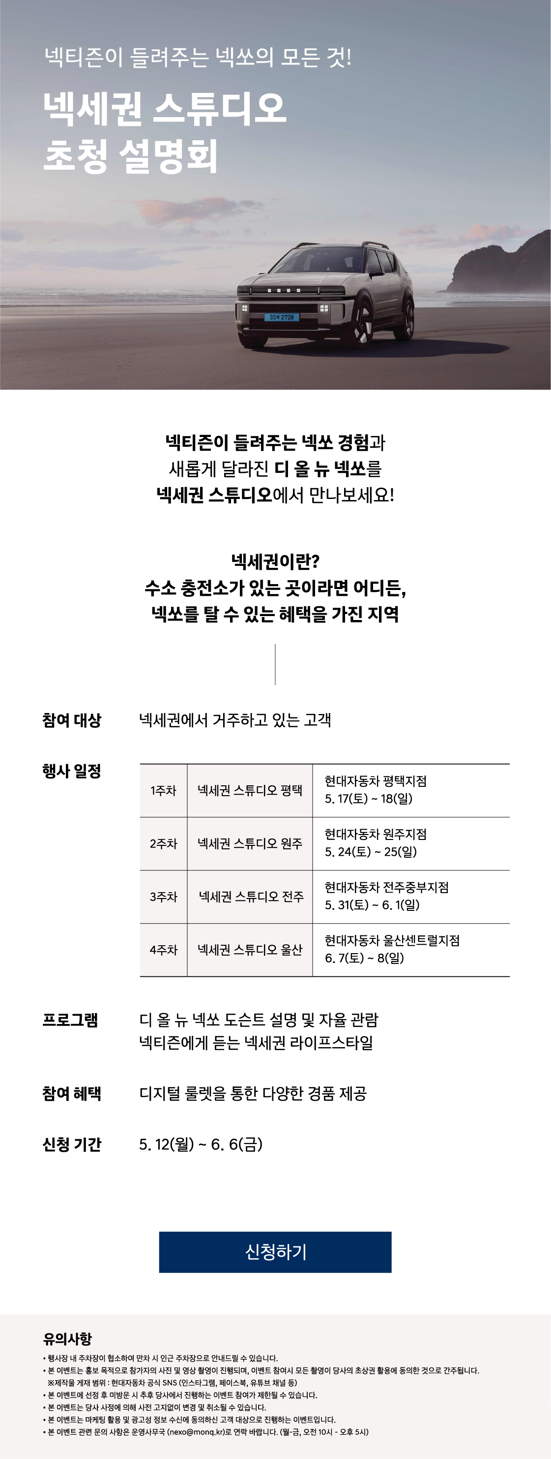 신청 기간은 5월 12일(월)부터 6월 6일(금)까지이며, 참여 대상은 넥세권(수소 충전소 인근)에 거주하는 고객이라고 해요. 수소차에 관심 있거나 구매를 고려 중이신 분들은 이번 기회를 놓치지 마세요! 행사 참여 시 촬영된 사진과 영상은 현대자동차 공식 SNS 등에 활용될 수 있으니 참고하시면 좋겠어요.