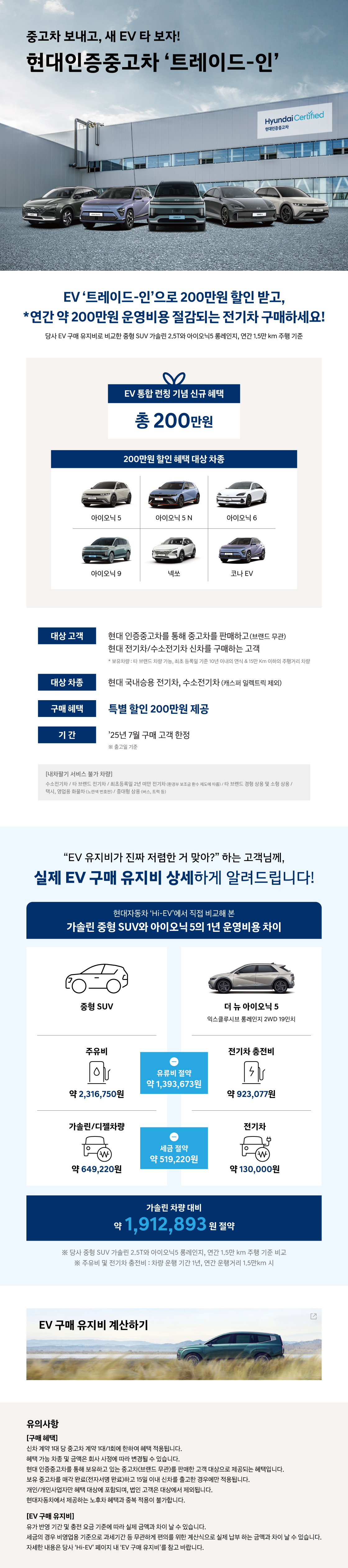 2025년 7월, 현대 인증중고차 트레이드인으로 중고차를 판매하고 현대 전기차 또는 수소차 신차로 교체하면 200만원 특별 할인을 받을 수 있어요. 게다가 연간 약 200만원의 운영비 절감 효과까지! 친환경차 전환, 지금이 기회입니다.