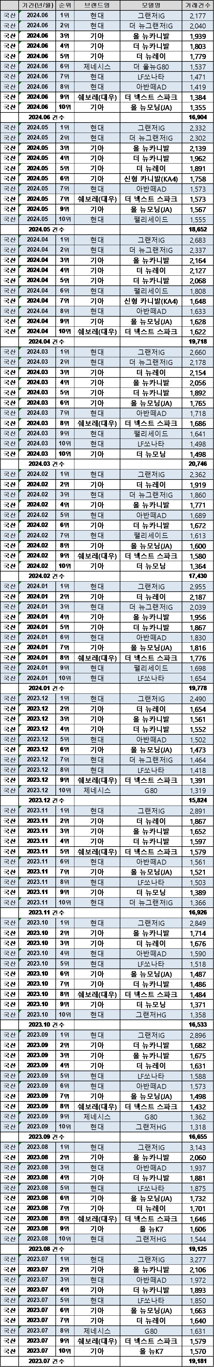 이어서 '더 뉴그랜저IG'가 2,040대로 2위를 차지했으며,