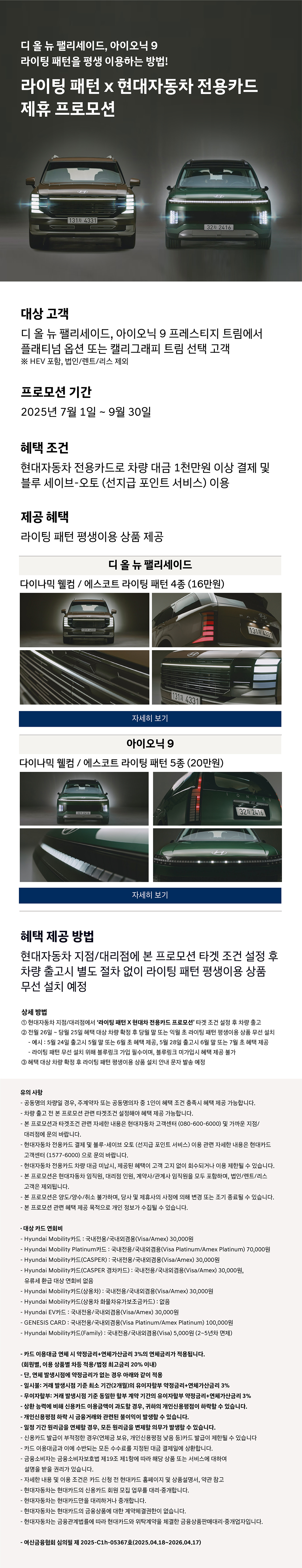 디 올 뉴 팰리세이드, 아이오닉 9 구매 고객을 위한 라이팅 패턴 평생이용 프로모션이 진행 중이에요.