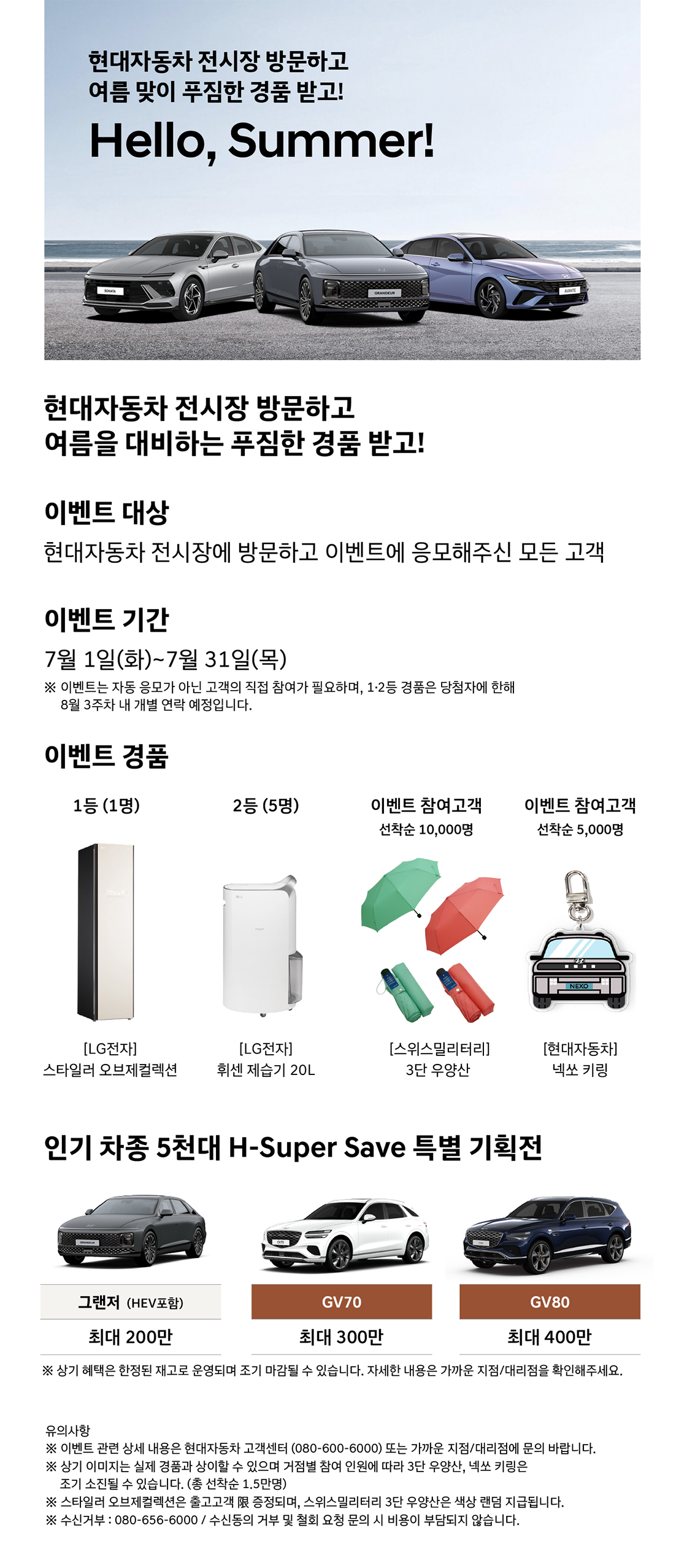 | 7월 1일(화)~7월 31일(목) | 현대자동차 전시장 방문 후 이벤트 응모 | 1등 LG 스타일러 오브제컬렉션(1명) 2등 LG 휘센 제습기 20L(5명) 선착순 스위스밀리터리 3단 우양산(10,000명), 넥쏘 키링(5,000명) |
