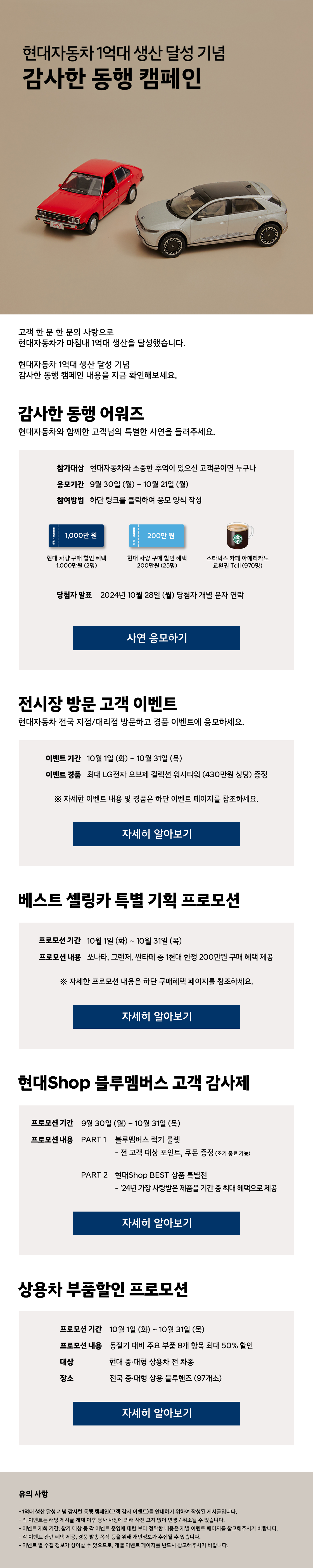 자동차가 고객 여러분께 감사의 마음을 전하고자 합니다. 다양한 이벤트에 참여하셔서 풍성한 혜택도 받고, 현대자동차와