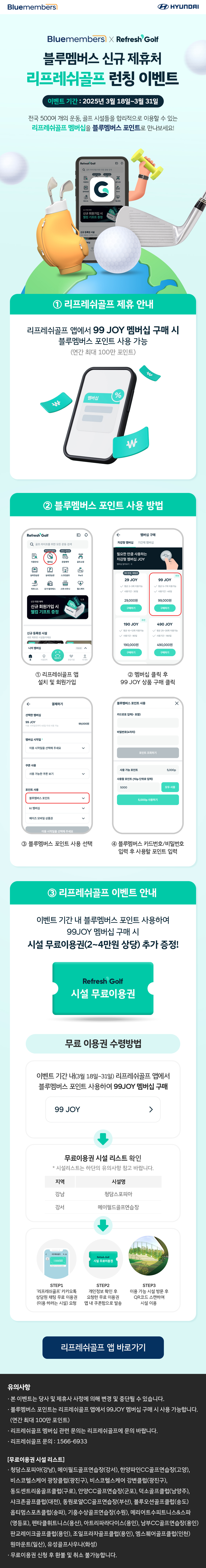 - 블루멤버스 포인트 사용: 리프레쉬골프 앱에서 99 JOY 멤버십 구매 시 블루멤버스 포인트로 결제 가능 (연간 최대 100만 포인트)