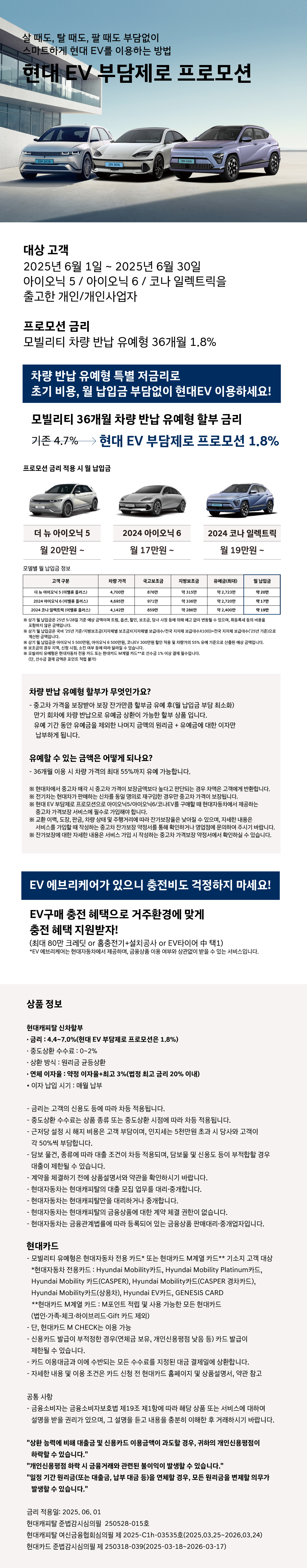 월 17만원부터 시작하는 현대 전기차로 환경도 지키고 경제적인 드라이빙을 경험해보세요. 6월 한 달간만 진행되는 특별 프로모션이니 서둘러 상담받아보시길 추천드려요!