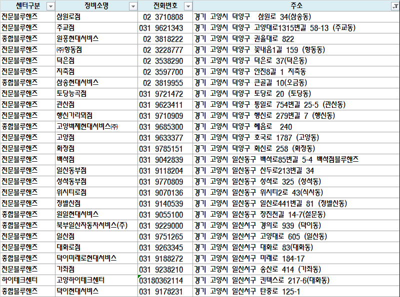 | 종합블루핸즈 | 덕이현대서비스 | 031 9178231 | 경기 고양시 일산서구 탄중로 125-1 |