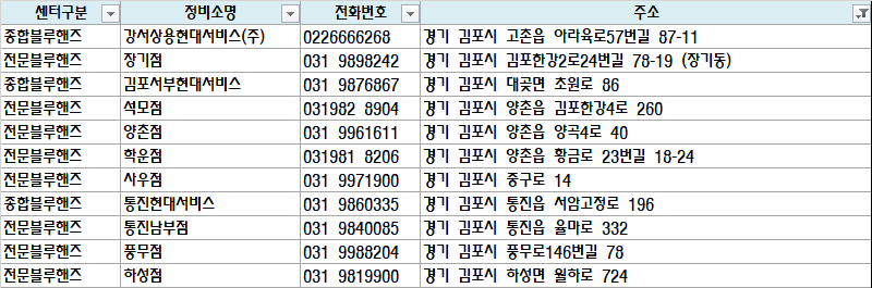 | 종합블루핸즈 | 강서상용현대서비스(주) | 0226666268 | 경기 김포시 고촌읍 아라육로57번길 87-11 |