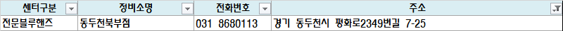 | 전문블루핸즈 | 동두천북부점 | 031 8680113 | 경기 동두천시 평화로2349번길 7-25 |