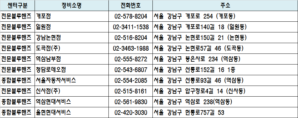| 종합블루핸즈 | 서울자동차서비스 | 02-554-2085 | 서울 강남구 선릉로93길 46 (역삼동) | 지도 |