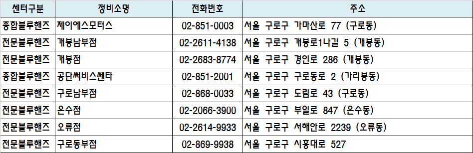 센터구분 정비소명 전화번호 주소 지도링크 종합블루핸즈 제이에스모터스 02-851-0003 서울 구로구 가마산로 77 (구로동) 지도 전문블루핸즈 개봉남부점 02-2611-4138 서울 구로구 개봉로1나길 5 (개봉동) 지도 전문블루핸즈 개봉점 02-2683-8774 서울 구로구 경인로 286 (개봉동) 지도 종합블루핸즈 공단써비스쎈타 02-851-2001 서울 구로구 구로동로 2 (가리봉동) 지도 전문블루핸즈 구로남부점 02-868-0033 서울 구로구 도림로 43 (구로동) 지도 전문블루핸즈 온수점 02-2066-3900 서울 구로구 부일로 847 (온수동) 지도 전문블루핸즈 오류점 02-2614-9933 서울 구로구 서해안로 2239 (오류동) 지도 전문블루핸즈 구로동부점 02-869-9938 서울 구로구 시흥대로 527 지도