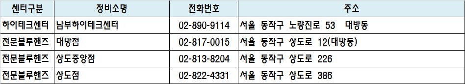 센터구분 정비소명 전화번호 주소 지도링크 하이테크센터 남부하이테크센터 02-890-9114 서울 동작구 노량진로 53 대방동 지도 전문블루핸즈 대방점 02-817-0015 서울 동작구 상도로 12(대방동) 지도 전문블루핸즈 상도중앙점 02-813-8204 서울 동작구 상도로 226 지도 전문블루핸즈 상도점 02-822-4331 서울 동작구 상도로 386 지도