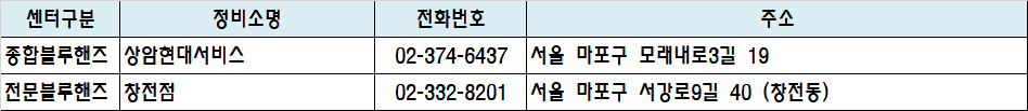 센터구분 정비소명 전화번호 주소 지도링크 종합블루핸즈 상암현대서비스 02-374-6437 서울 마포구 모래내로3길 19 지도 전문블루핸즈 창전점 02-332-8201 서울 마포구 서강로9길 40 (창전동) 지도
