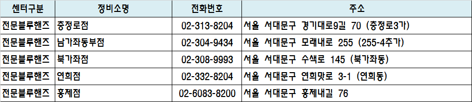 센터구분 정비소명 전화번호 주소 지도링크 전문블루핸즈 충정로점 02-313-8204 서울 서대문구 경기대로9길 70 (충정로3가) 지도 전문블루핸즈 남가좌동부점 02-304-9434 서울 서대문구 모래내로 255 (255-4추가) 지도 전문블루핸즈 북가좌점 02-308-9993 서울 서대문구 수색로 145 (북가좌동) 지도 전문블루핸즈 연희점 02-332-8204 서울 서대문구 연희맛로 3-1 (연희동) 지도 전문블루핸즈 홍제점 02-6083-8200 서울 서대문구 홍제내길 76 지도
