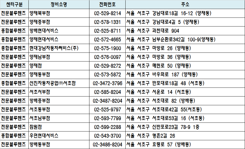 센터구분 정비소명 전화번호 주소 지도링크 전문블루핸즈 양재북부점 02-529-8214 서울 서초구 강남대로18길 16-12 (양재동) 지도 전문블루핸즈 양재중부점 02-578-1331 서울 서초구 강남대로4길 5 (양재동) 지도 종합블루핸즈 방배현대서비스 02-525-8711 서울 서초구 과천대로 904 지도 종합블루핸즈 양재현대서비스 02-572-4665 서울 서초구 남부순환로342길 100-9(양재동) 지도 종합블루핸즈 현대강남자동차써비스(주) 02-575-1900 서울 서초구 마방로 26 (양재동) 지도 전문블루핸즈 양재남부점 02-576-0097 서울 서초구 마방로 36 (양재동) 지도 전문블루핸즈 양재점 02-529-8272 서울 서초구 매헌로 50 (양재동) 지도 전문블루핸즈 양재동부점 02-573-5872 서울 서초구 바우뫼로 187 (양재동) 지도 종합블루핸즈 선진자동차공업㈜서초점 02-3472-3796 서울 서초구 반포대로18길 48 (서초동) 지도 전문블루핸즈 서초서부점 02-585-8204 서울 서초구 서운로 14 (서초동) 지도 전문블루핸즈 방배중부점 02-3487-8204 서울 서초구 서초대로 82 (방배동) 지도 전문블루핸즈 서초동부점 02-525-9797 서울 서초구 서초대로42길 55(서초동) 지도 전문블루핸즈 서초남부점 02-593-7799 서울 서초구 서초대로53길 16 (서초동) 지도 전문블루핸즈 잠원점 02-599-2288 서울 서초구 신반포로23길 78-9 1층 지도 종합블루핸즈 우면현대서비스 02-543-3700 서울 서초구 형촌2길 26 지도 전문블루핸즈 방배동부점 02-3486-8204 서울 서초구 효령로 57 (방배동) 지도