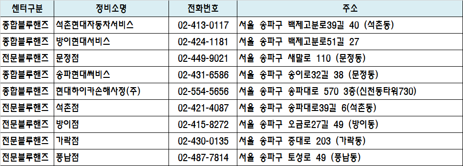 센터구분 정비소명 전화번호 주소 지도링크 종합블루핸즈 석촌현대자동차서비스 02-413-0117 서울 송파구 백제고분로39길 40 (석촌동) 지도 종합블루핸즈 방이현대서비스 02-424-1181 서울 송파구 백제고분로51길 27 지도 전문블루핸즈 문정점 02-449-9021 서울 송파구 새말로 110 (문정동) 지도 종합블루핸즈 송파현대써비스 02-431-6586 서울 송파구 송이로32길 38 (문정동) 지도 종합블루핸즈 현대하이카손해사정(주) 02-554-5656 서울 송파구 송파대로 570 3층(신천동 타워730) 지도 전문블루핸즈 석촌점 02-421-4087 서울 송파구 송파대로39길 6(석촌동) 지도 전문블루핸즈 방이점 02-415-8272 서울 송파구 오금로27길 49 (방이동) 지도 전문블루핸즈 가락점 02-430-0135 서울 송파구 중대로 203 (가락동) 지도 전문블루핸즈 풍납점 02-487-7814 서울 송파구 토성로 49 (풍납동) 지도