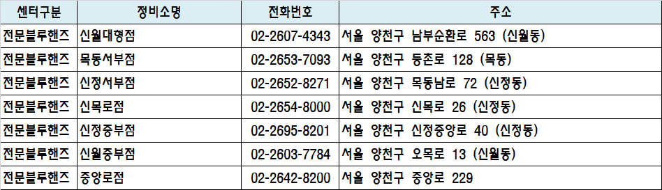 센터구분 정비소명 전화번호 주소 지도링크 전문블루핸즈 신월대형점 02-2607-4343 서울 양천구 남부순환로 563 (신월동) 지도 전문블루핸즈 목동서부점 02-2653-7093 서울 양천구 등촌로 128 (목동) 지도 전문블루핸즈 신정서부점 02-2652-8271 서울 양천구 목동남로 72 (신정동) 지도 전문블루핸즈 신목로점 02-2654-8000 서울 양천구 신목로 26 (신정동) 지도 전문블루핸즈 신정중부점 02-2695-8201 서울 양천구 신정중앙로 40 (신정동) 지도 전문블루핸즈 신월중부점 02-2603-7784 서울 양천구 오목로 13 (신월동) 지도 전문블루핸즈 중앙로점 02-2642-8200 서울 양천구 중앙로 229 지도