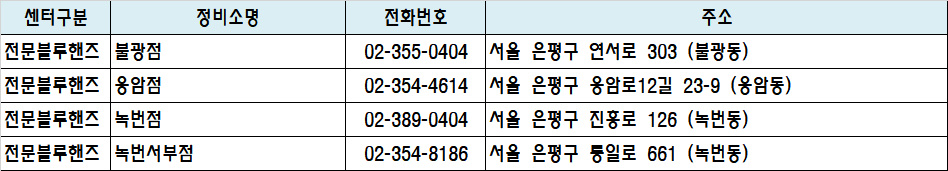| 전문블루핸즈 | 불광점 | 02-355-0404 | 서울 은평구 연서로 303 (불광동) | 지도 |