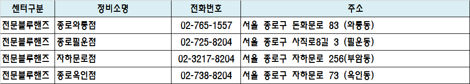 | 전문블루핸즈 | 자하문로점 | 02-3217-8204 | 서울 종로구 자하문로 256(부암동) | 지도 |