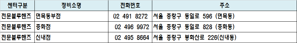 | 전문블루핸즈 | 중화점 | 02-496-9972 | 서울 중랑구 동일로 828 (중화동) | 지도 |