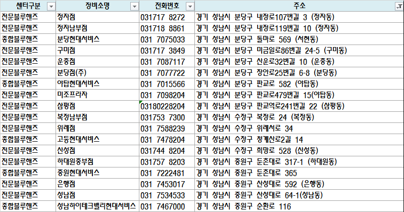 | 종합블루핸즈 | 분당현대서비스 | 031 7075033 | 경기 성남시 분당구 돌마로 569 (서현동) |