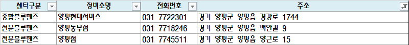| 종합블루핸즈 | 양평현대서비스 | 031 7722301 | 경기 양평군 양평읍 경강로 1744 |