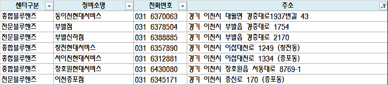 | 종합블루핸즈 | 동이천현대서비스 | 031 6370063 | 경기 이천시 대월면 경충대로1937번길 43 |