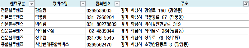 | 종합블루핸즈 | 하남현대종합서비스 | 0269562470 | 경기 하남시 초광산단동로 8 (광암동) |